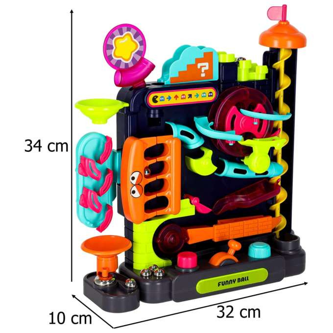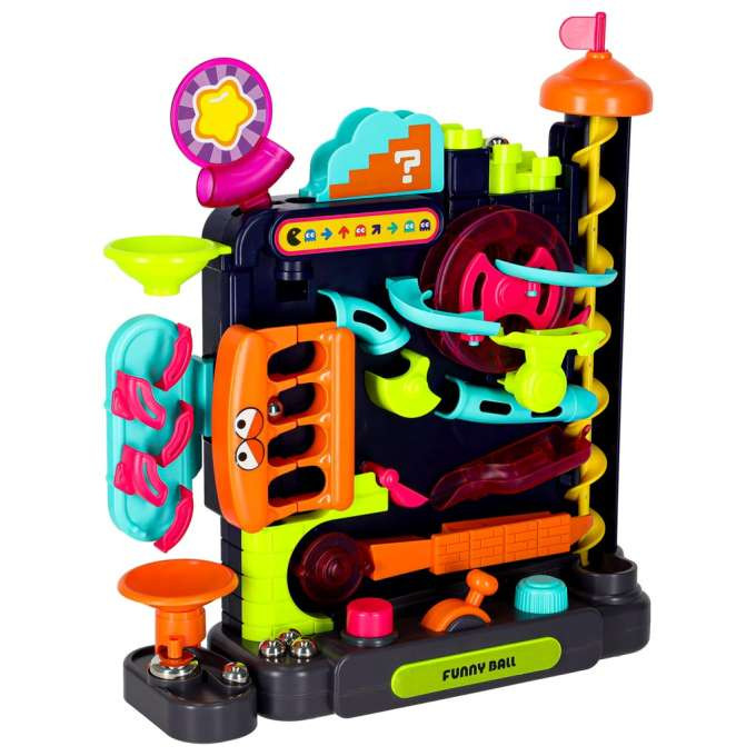 A Labdás Akadálypálya egy kirakós játék, amely fejleszti a finommotoros készségeket és támogatja a logikus gondolkodást . A mellékelt képes útmutató világosan bemutatja a játék menetét. Hat labda áll rendelkezésedre, és a feladatod, hogy a táblán található emelők és távtartók segítségével a célvonalig vezesd őket .