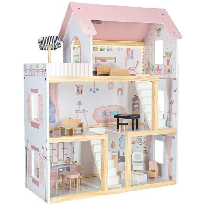 Ez a LED-es világítású babaház pasztellszíneivel – a finom rózsaszín, fehér és natúr fa kombinációjával – rabul ejti a látogatókat . Nem csupán játék, hanem egy bájos kiegészítője is egy gyerekszobának. A meleg LED-es világítás varázslatos bájt kölcsönöz a belső térnek, és meghitt hangulatot teremt az esti babázáshoz.