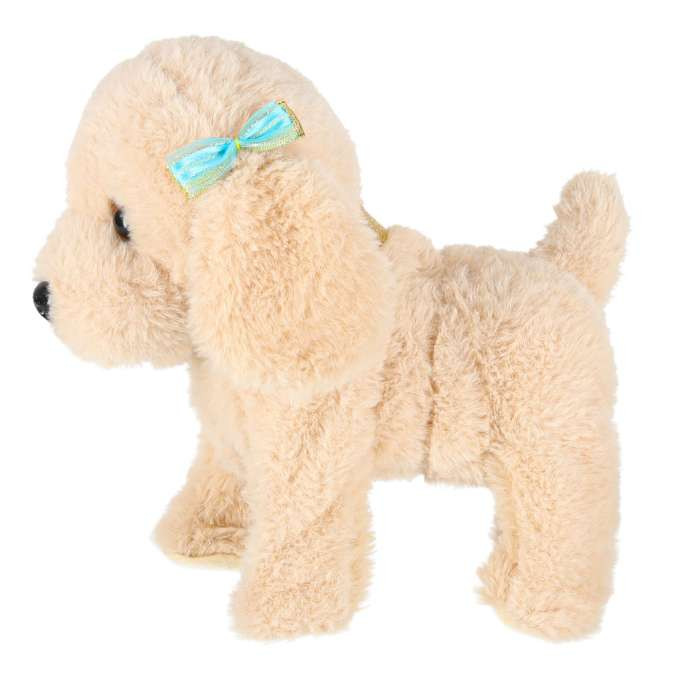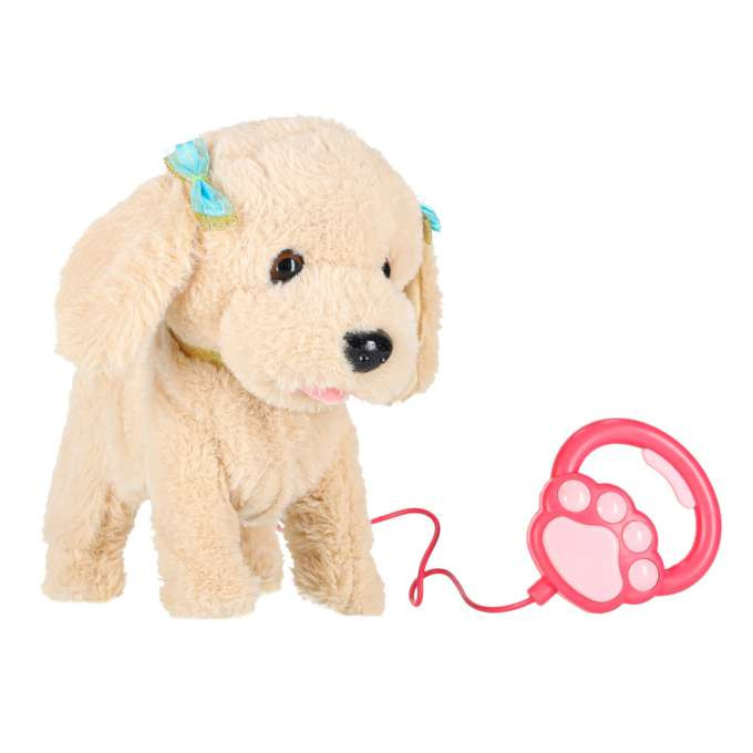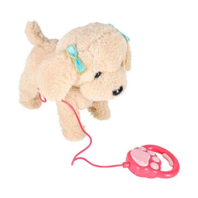 Szín: bézs színű kutya, kék-arany kiegészítők, rózsaszín póráz