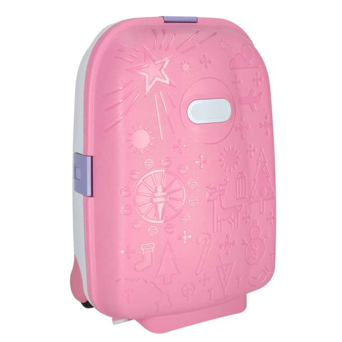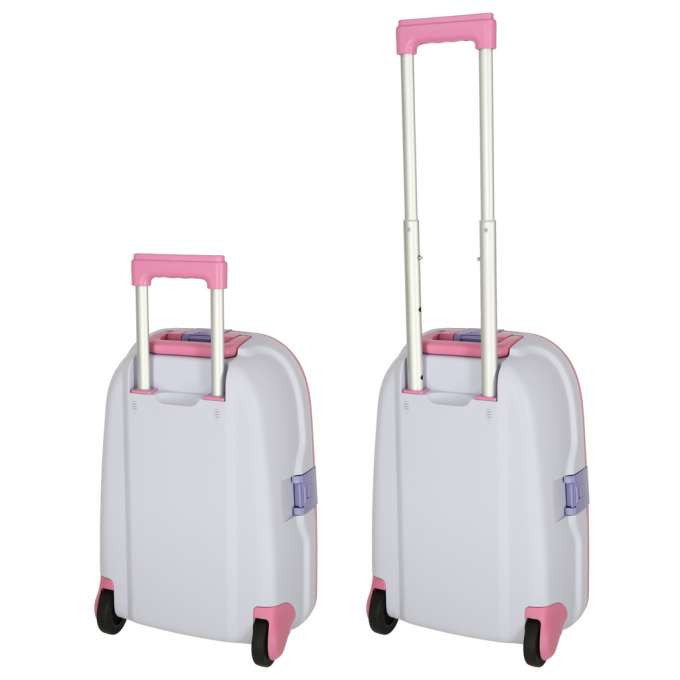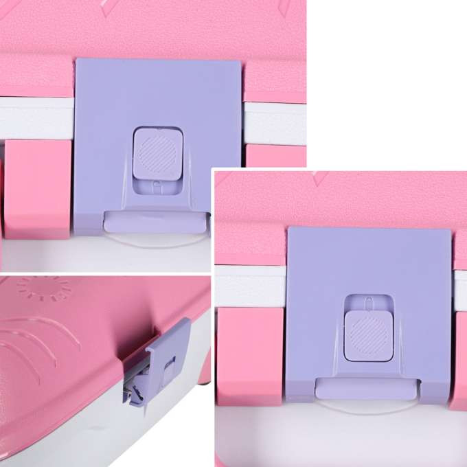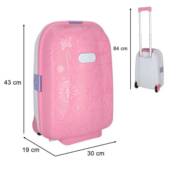 Tartós, sérülésálló anyagból készült kis gyerekbőrönd rózsaszín és fehér színben. Két gumi kerékkel és teleszkópos alumínium fogantyúval rendelkezik , amely lehetővé teszi a bőrönd kényelmes húzását. Három retesszel zárva. A bőrönd belsejében kompressziós pántok és egy cipzáras zseb található. A készlet tartalmaz matricákat a bőrönd felcímkézéséhez.
