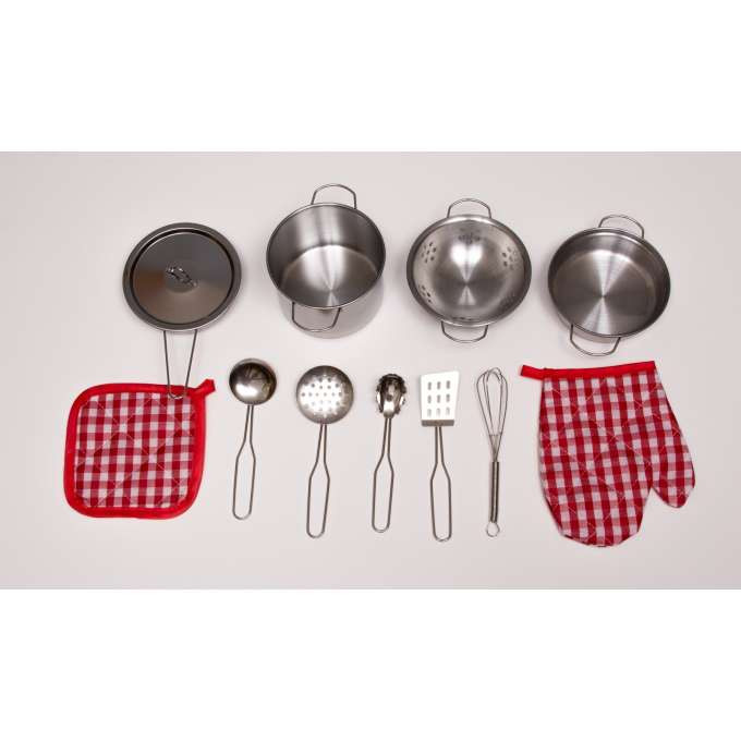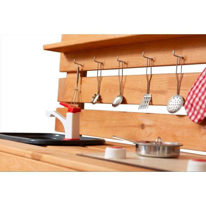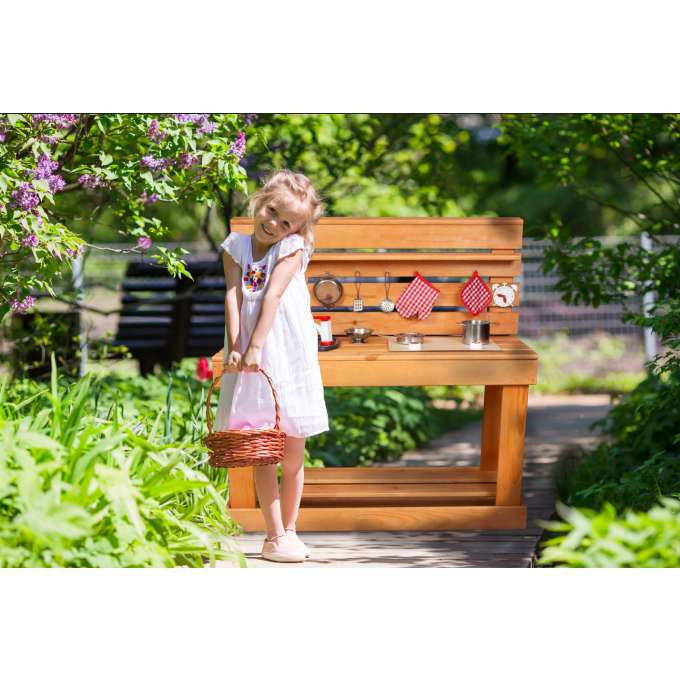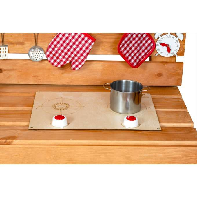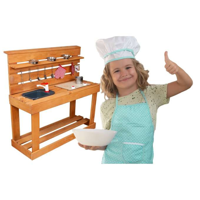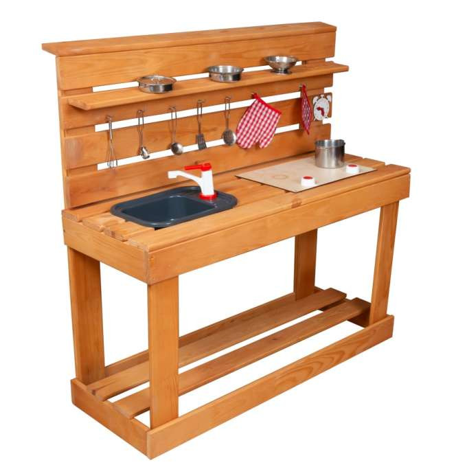 Fából készült sárkonyha gyerekeknek. Műanyag mosogató csappal és fakályha van benne . A készlet konyhai kiegészítőket is tartalmaz , beleértve az edényeket, egy spatulát és egy szűrőedényt. A munkalap alatti nyitott polc és a felső polc ideális hely a konyhai kiegészítők és más gyermekjátékok tárolására. A sárkonyha nagyszerű módja annak, hogy aktívan szórakozz a szabadban.