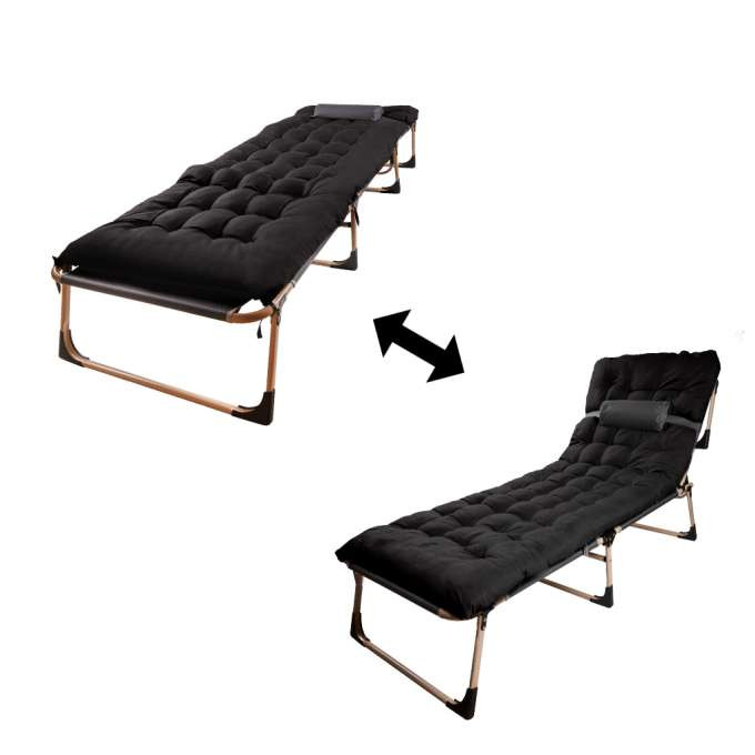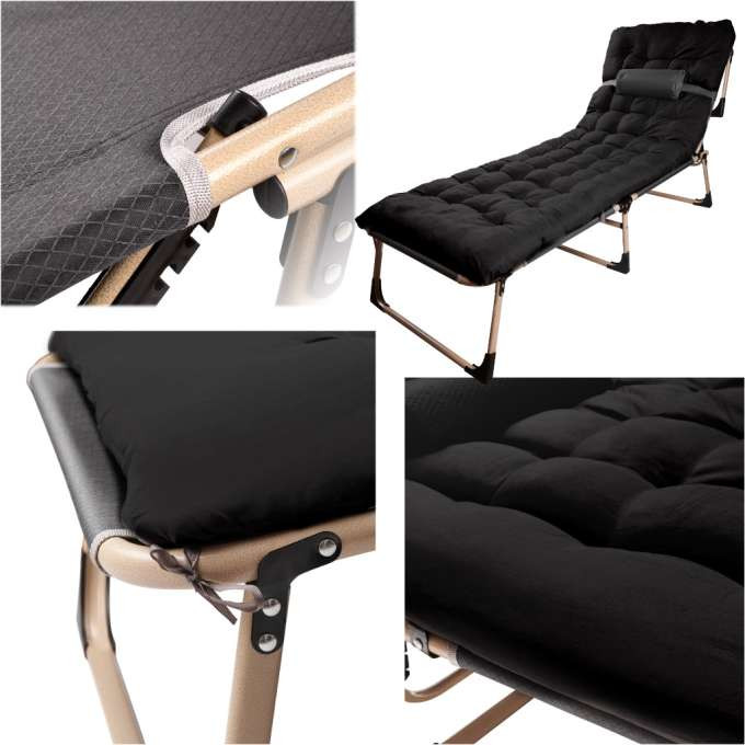 Egy összecsukható kempingágy tökéletes módja a kikapcsolódásnak kempingben, a kertben és otthon is. Az összecsukás lehetőségének köszönhetően könnyen bárhová magaddal viheted, de gond nélkül tárolhatod is. A négy támasztékkal ellátott, masszív acélszerkezet akár 120 kilogrammot is elbír , garantálva a stabilitást és a biztonságot bármilyen szunyókálás során. Az állítható háttámla kényelmes háttámaszt nyújt, így kényelmes testtartást biztosít még hosszabb pihenés során is. A mellékelt párnák (egy nagy az egész ágynak és egy kicsi a fej alá) tovább növelik a kényelmet.